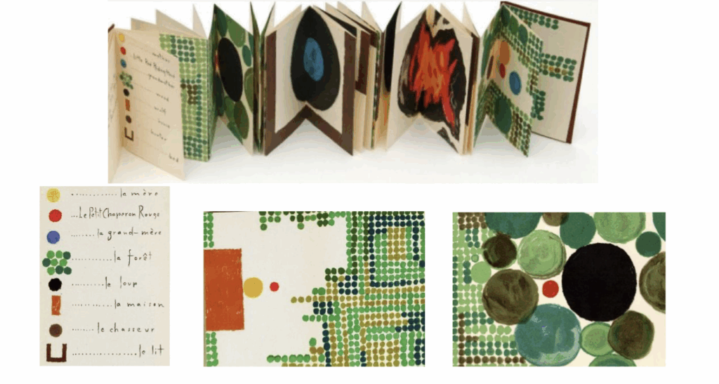 Cette artiste suisse, connue pour ses livres en accordéon où le texte est remplacé par des symboles graphiques, a notamment revisité « Le Petit Chaperon rouge » sous la forme d’une longue bande de 4,74 mètres. Dans son oeuvre, chaque personnage et élément de décor est symbolisé par une forme et une couleur précises, créant un langage visuel poétique et épuré.