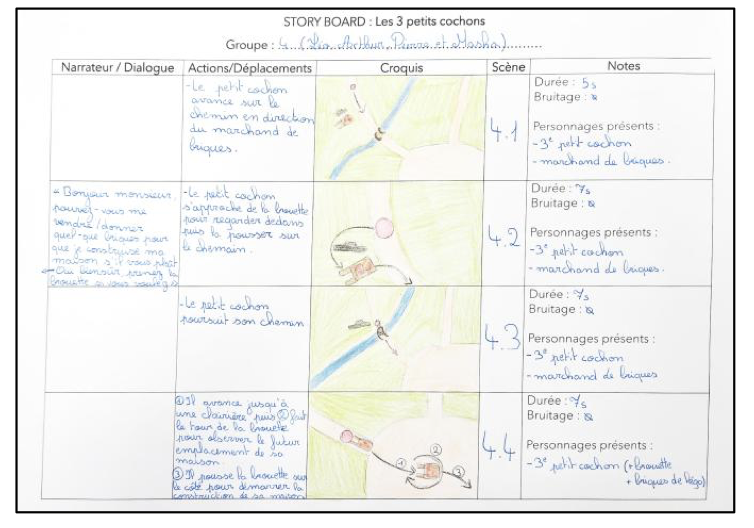 Chaque groupe a ensuite élaboré un storyboard précis, anticipant les déplacements des personnages, la durée des séquences, les effets sonores et les éventuels dialogues. Ces derniers se sont révélés inutiles tant la narration visuelle suffisait à elle seule.