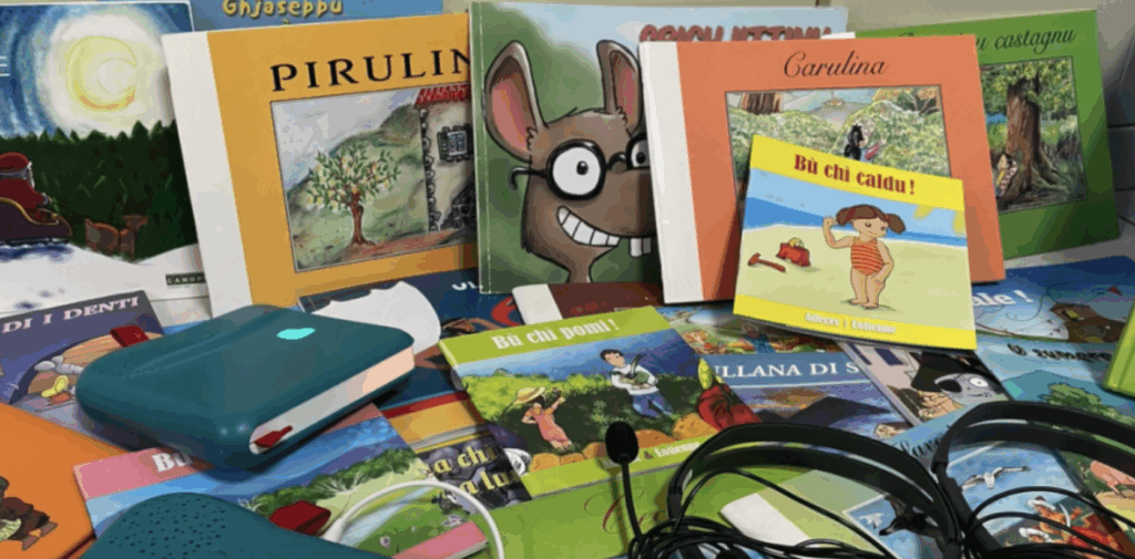 Tragu’Libru, c’est une bibliothèque nomade de prêt comprenant une sélection de livres en langue corse, issus des dotations de Canopé et de l’ADECEC , deux conteuses numériques Bookinou et des casques.
