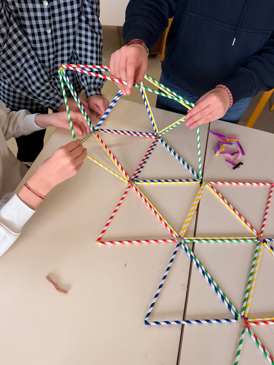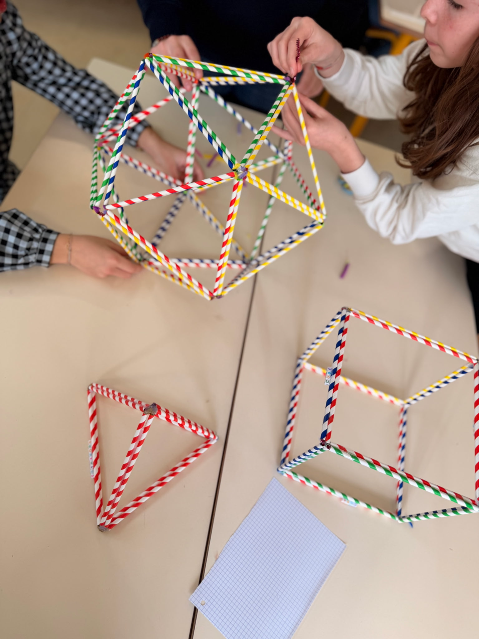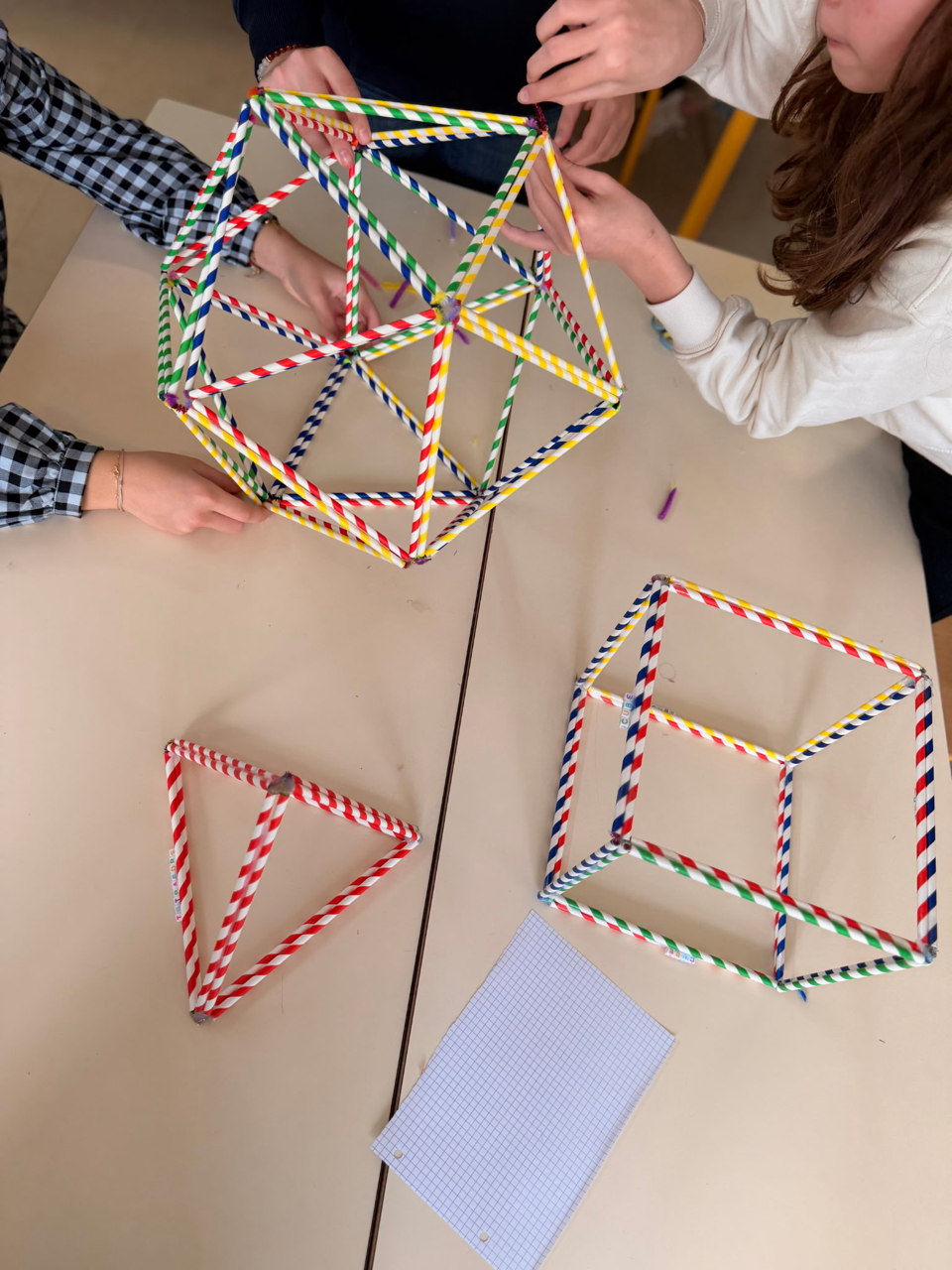 Les élèves de sixième du collège de Propriano ont profité de la semaine des mathématiques pour travailler la géométrie de façon ludique. Ils ont utilisé et assemblé de simples pailles pour construire des cubes, des tétraèdres, des octaèdres, des dodécaèdres et des icosaèdres. Nous les félicitons pour leur persévérance et pour ce beau travail collaboratif.